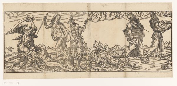 Daniel Nikolaus Chodowiecki created this print titled 'Bringing Home the Bride' using etching. At the forefront, we see Cupid, the god of love, carrying a torch. He holds a banner that reads "Au Rendez-Vous", a call to meet or unite, thus sanctifying marriage. The motif of carrying the bride, central here, echoes ancient Roman traditions where the bride was carried over the threshold, a symbolic act to ward off evil spirits. Here, the bride is unceremoniously bundled in a sack on the back of a man. This imagery clashes with the romantic symbolism of Cupid. The seemingly joyous procession, complete with musical accompaniment, feels more like a sardonic commentary on marriage. The presence of the stork above may have been a reference to fertility and childbirth. This image engages viewers on a subconscious level, evoking the complex tapestry of emotions associated with marriage, desire, and societal expectations. The past is never dead. It is not even past.
