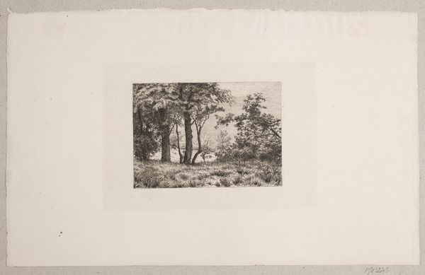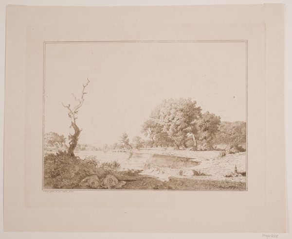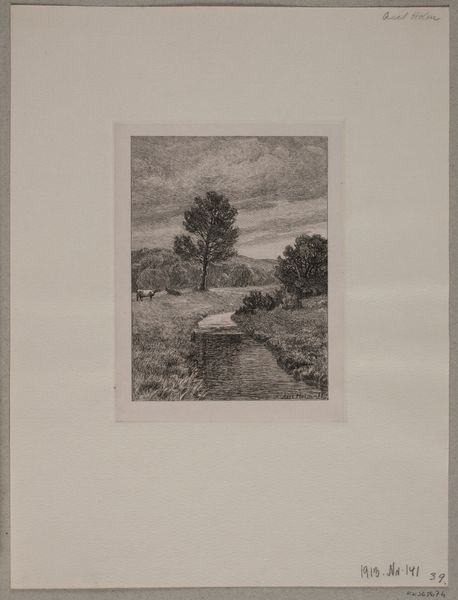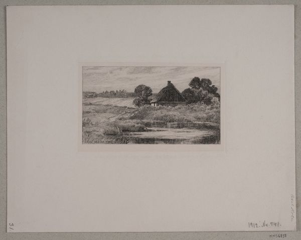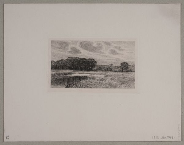 Editor: Here we have Axel Holm’s "Ved indsøen," an etching from 1893. The overall mood is very calm; it’s like a captured moment of stillness. What visual elements stand out to you most? Curator: The relationship between light and dark, particularly the contrasts created through the etching technique. Note how Holm modulates the density of the lines to give depth and form. How the horizontal lines across the water surface break, and how it creates a spatial effect of recession. Editor: I see it now, it gives such depth and movement to the piece. But can this choice limit how the image can be viewed? Curator: Limitation suggests constraint, but in this case, consider it more of a focusing of attention. By controlling the density of lines and the stark contrast, Holm directs the eye toward specific forms and textures, intensifying their presence within the overall composition. Is the focal point the clouds or the water? How does that relationship create movement in the work? Editor: It seems both! The clouds give depth, but then your eye also goes immediately down to the water. The reflections almost mimic the sky, blending space. Curator: Precisely! The artist masterfully manipulates the material qualities of the medium to transcend mere representation and achieve an evocative visual experience. Notice also the foreground: it seems to push the whole composition into the distance. Editor: The subtle details add so much complexity. I never thought just the lines could create this visual effect. I’ll certainly look at etchings with more scrutiny now. Curator: Indeed, art invites continued exploration and ever rewards close study.