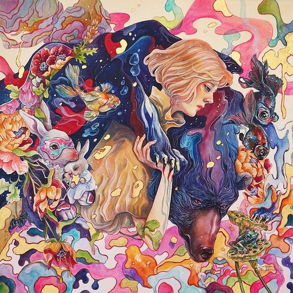 Curator: Daria Theodora's mixed-media work, "That Night, We Said Goodbye," created in 2019, is a fascinating blend of portraiture and fantasy art, wouldn't you agree? Editor: Absolutely! My initial gut reaction? It feels like a farewell dreamt up by a melancholic fairy, drenched in lush botanicals that seem to whisper secrets. It's enchanting but unsettling. Curator: Theodora's command of color certainly enhances that emotional tension. Observe how the vibrant, almost psychedelic flora contrasts sharply with the figure’s muted, pallid complexion. The juxtaposition is quite deliberate. Editor: It really sings to me! And the… creature companions? Is that a fair term? Are they figments, symbolic weights, maybe extensions of the figure’s internal state? Each element hums with potential interpretations! The drips… tears… it all makes you ache. Curator: Consider, too, the influence of Art Nouveau—the curvilinear lines, the decorative floral motifs—they are strategically deployed to frame and, arguably, confine the central figure within a highly stylized, constructed space. This reinforces the sense of emotional constraint. Editor: The symmetry of the avian-esque forms mirrored on either side of the figure really traps the gaze as well. Their glassy, red eyes and weeping liquids only contribute to the overall vibe. I find myself caught between admiration for the artist's technical prowess and a real pang of empathetic sadness. It is masterful! Curator: Precisely! Theodora invites a dialogue between form and feeling, artifice and emotion. Ultimately it evokes that duality of experience. Editor: Absolutely. It is that strange beauty in sorrow that is captivating here. A haunting and beautifully bittersweet moment preserved on… whatever medium this is. Just divine.