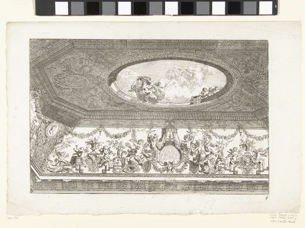 Curator: Here we have "Plafond met achthoekig ontwerp", or "Ceiling with Octagonal Design", created around 1712 by Daniël Marot, currently held in the Rijksmuseum collection. Editor: Oh, my! Talk about Baroque excess. It looks like a sugar rush dreamscape meticulously rendered with a caffeinated pen. What do you make of all this ornamentation? Curator: It exemplifies Marot's influence on interior design, a reflection of courtly power and the cultural priorities of the elite at the time. Note how the architectural elements are seamlessly integrated with mythological scenes. Editor: Courtly power, absolutely! Imagine lying on your back staring up at all those frolicking cherubs and overflowing garlands. It's a bombardment of cheerfulness, or maybe a visual dare, pushing ornament to its absolute limit. Curator: It also reveals something about the patronage system of the era. Designs like these weren't simply artistic exercises; they were proposals, statements of intent vying for prestigious commissions. Editor: Which makes the meticulous detail fascinating! This wasn't some sketch on a napkin. Every flourish, every cherub dimple was crafted to impress. Is that supposed to be perspective I see there or something more representative? Curator: The rendering serves a dual purpose. It had to demonstrate the grandeur while also serving as a blueprint. But to your point about representation, absolutely! Remember, the aim was to transform spaces. To build not just walls and ceilings but stage sets for lives of spectacle. Editor: Spectacle is right! I wonder what it feels like to actually live in such excess. Almost suffocating, don’t you think? But that rendering, that's gorgeous in its way, a testament to draftsmanship even when employed to illustrate overwhelming design. Curator: It speaks to how much design shapes and reflects power and ambition. Looking back we can read quite directly what life was like at that time. Editor: Indeed, what stories are reflected, what hopes realized. As much a story as it is a set of plans. And with that I am spent and sated with ceiling dreams and baroque wonder!
