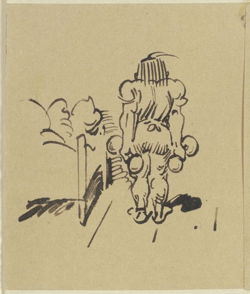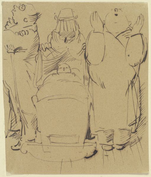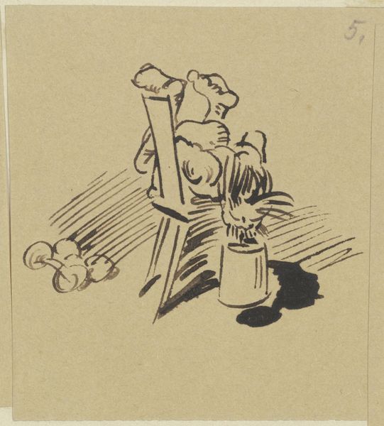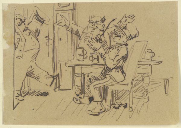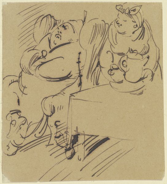 Curator: This is an ink drawing by Wilhelm Busch, created in 1871. Its full, rather descriptive, title is "Derweil sitzt unten beim Kaffee - Herr Meck und deutet in die Höh'." It currently resides in the Städel Museum. Editor: What strikes me first is the stark contrast – the chaotic scene above and the somewhat serene domesticity below. There's this wonderful awkwardness to the figure struggling on the upper level, almost slapstick. Curator: Busch was, of course, a master of social commentary delivered with humor. The juxtaposition you mention isn't accidental. He often used domestic scenes to comment on the absurdity of human behavior, particularly within the context of 19th-century German society. The upper scene could be interpreted as the struggle, the labour and the efforts of an upstair’s man with an object over his head while below there are his housemates sitting while pointing to the struggles the other faces. Editor: Yes, that tension! And I love how economical his lines are. With just a few strokes of ink, he captures the frustration, the bewilderment... and the slight menace of that overloaded figure looming above. It's almost like a visual pun, isn't it? Curator: Indeed. Think of it within the burgeoning industrial landscape of the time. The man upstairs straining under the weight... he could represent the working classes burdened by the demands of a rapidly changing economy, while those below are disconnected and ignorant. This comic framing critiques class divisions, power structures, and the disconnect from everyday reality. Editor: I’m also thinking of the space of home and domesticity, what is revealed within its architecture and mundane routines. Curator: Exactly! Busch uses the interior, this seemingly intimate scene of coffee and conversation, as a stage for revealing wider societal inequalities and blind spots. It forces us to question who benefits from comfort and who bears the weight, both literally and figuratively. Editor: It really is a delicious little gem. Simple, yet profoundly resonant. You look at it and chuckle, but it stays with you, prompting thought and reflection. Curator: Busch understood the power of accessible imagery to convey complex social truths. The drawing remains strikingly relevant even now, urging us to examine our own roles within the larger systems around us.