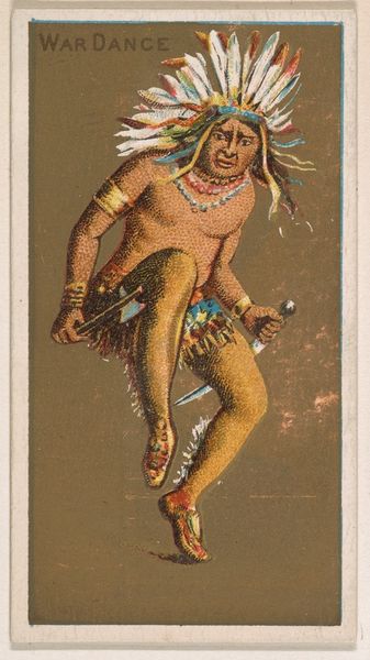 This small chromolithograph was produced in the late 19th century by the cigarette company Allen & Ginter, as part of a series called "Natives in Costume." It features a man identified as an "American Indian," standing in a landscape. The image creates meaning through its visual codes, cultural references, and historical associations. The man’s clothing and spear signify a particular, romanticized vision of Native American life, one that had been circulating in popular culture since the early 1800s. Consider how the commercial context of the cigarette card—a marketing tool—shapes the image's purpose. It reflects the prevailing attitudes of the time, perpetuating stereotypes and contributing to the erasure of diverse Native American identities in favor of a simplified, marketable image. Understanding this artwork requires historical research into the social and cultural context of the late 19th century, including the history of Native American representation, the rise of consumer culture, and the role of advertising. By examining these factors, we can better understand the complex and often contradictory meanings embedded in this seemingly simple image.