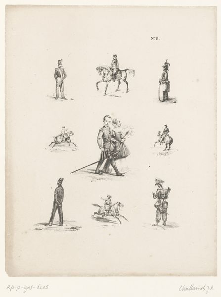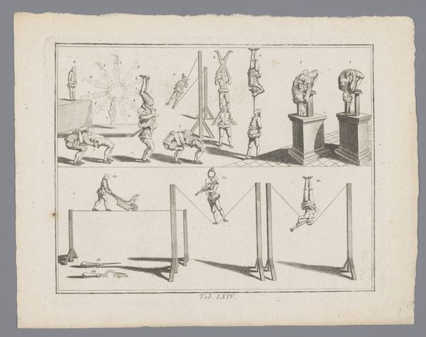 Curator: This lithograph, titled "Prøveblad med akrobater," by N.B. Krossing, offers a glimpse into a world of physical daring and spectacle. It dates to between 1795 and 1854. Editor: My first impression is of playful energy; there's a sketch-like quality that feels very immediate and joyful. A study of figures in motion, almost like a storyboard. Curator: Indeed, the artist seems to be exploring different poses and gestures, capturing fleeting moments of acrobatic performance and physical skill. The pen work itself emphasizes the linearity, with simple forms dominating the picture plane, all organized with careful attention to the page as a field. Editor: The acrobats and performers—they evoke a sense of wonder and perhaps even the precariousness of such pursuits. It's more than just bodies in space; it’s a peek into a culture where spectacle held significance. We can think of it as a metaphor for life itself—balancing acts, feats of skill, and the occasional tumble. Curator: Precisely. The composition uses relatively few marks to convey a variety of activities. Notice the repetition of forms; circular, vertical, and the oblique. Consider how Krossing captures volume through slight modulations in line weight. This speaks to his observational skills. Editor: Are we also seeing the darker side, the commedia dell’arte echoes and satire? One figure is upside down; perhaps this is the fool—a reminder of earthly reversals. And that strange animalistic, or masked, performer? Symbols often hide in plain sight within seemingly lighthearted images. Curator: Possibly. What's fascinating to me is how the composition balances overall unity with internal variety, each element essential for visual harmony. Each figure relates to the next via a constant game of visual echoes and rhymes. Editor: This piece really opens a door into understanding the layers that performance and identity play in art, then and now. It reminds us that symbols continue to resonate, informing our emotional responses across centuries. Curator: I concur. Krossing masterfully captures dynamic movement with minimalist expression, leaving an open field for the viewer's interpretation. Editor: It's a vivid memento. One that connects us to those acrobatic performers and, more broadly, to our cultural heritage.