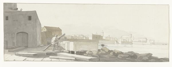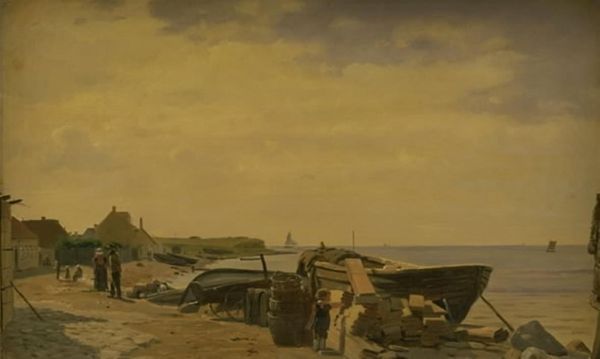 Editor: So, here we have Albert Bierstadt's "Wharf Scene," an oil painting from an unknown date. It gives off this really somber mood, almost like a ghost town by the sea. What do you see in this piece? Curator: This wharf scene, stripped of the romanticized grandeur often associated with Bierstadt's landscapes, invites us to consider the underbelly of industrial progress in the 19th century. What narratives are silenced when we focus solely on majestic landscapes? Editor: That’s interesting. I hadn't thought of it that way. So you are saying it’s less about beauty and more about social commentary? Curator: Precisely. The dilapidated structures and muted tones may act as a critique of the social cost of maritime industries and the workers left behind. Can we consider this a representation of the environmental impact caused by these industries? What does it mean to frame labor and environment as themes? Editor: Wow. So by focusing on a seemingly mundane scene, Bierstadt is actually drawing attention to the consequences of industrial expansion that might normally be overlooked. Is the lack of people also part of that statement? Curator: Absolutely. The absence of figures encourages viewers to consider those who have been erased from dominant historical narratives: the working class, immigrants, and other marginalized communities. How might their stories reshape our understanding of the American Dream? Editor: I see. It’s almost like he is asking us to fill in the blanks. This has really given me a new perspective. I will consider Bierstadt very differently now. Curator: Excellent. Engaging with art this way can inspire a new type of awareness.