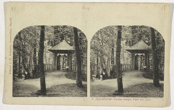Curator: Let's take a look at "View of a Dairy in Le Hameau de la Reine near the Petit Trianon". This albumen print was created by Ernest Eléonor Pierre Lamy between 1860 and 1880. Editor: The symmetry is immediately striking, even duplicated here in stereoscopic form. And it evokes a dream-like, almost theatrical pastoral atmosphere, would you agree? Curator: Absolutely. The Dairy at the Hameau de la Reine was designed as part of Marie Antoinette's idealised, rustic village. This image reveals much about the socio-political context of the late 18th century as filtered through the lens of mid-19th century photography. The 'natural life' on display, of course, was entirely contrived for the Queen's pleasure, a deliberate staging of simplicity. Editor: Indeed. And within this image, the manipulation is further mediated by Lamy's choice of light and shadow. Note the crisp contrasts, achieved no doubt through careful darkroom practices. The tonality is critical to creating this picturesque effect. The composition relies heavily on the way the trees frame the dairy. It gives it an almost artificial perspective, very composed. Curator: Right. And such fabricated representations were widespread. Consider how such staged environments functioned: offering a visual retreat for the aristocracy, removed from the stark realities of peasant life and political instability that would lead to the Revolution. Editor: Which speaks volumes about how idyllic visions are frequently created to mask less desirable realities, I should think. Photography had a role to play in shaping that message. This specific photograph flattens any possibility of revolutionary sentiment with the even and artful distribution of light and its overall construction. Curator: Precisely. Images such as this shaped popular perception of the period. By representing idealized settings, it serves to legitimize a hierarchical societal order and presents an anodyne picture of class disparity. Editor: Well, this print's precise rendering certainly draws the eye in to discern that underlying structure. And in some way it almost invites questioning of its assumed naivete. It is, in essence, an extremely well-made historical artefact on its own merits. Curator: Agreed. Examining this photographic work gives us valuable insight into the political power of curated imagery and historical narrative.