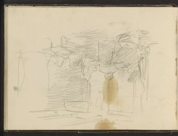 Willem Troost created "Wolken, koeien, een paardenkop en een figuur" with pen and brush in grey ink and watercolour. The artwork presents a study in contrasts. On the left, we see the fluid, almost ethereal rendering of clouds using soft, diluted watercolors that blend seamlessly, evoking a sense of atmospheric depth. This contrasts with the right side where the artist employs precise, linear pen strokes to depict cows and a horse's head. These animal figures appear almost scientific in their detail and structure, with each line carefully delineating form and texture. The composition creates a visual dialogue between the natural and the representational, challenging our perception by juxtaposing transient, atmospheric phenomena with concrete, representational forms. The use of negative space further accentuates these elements. This interplay encourages us to reflect on the relationship between nature, representation, and the artist's hand.