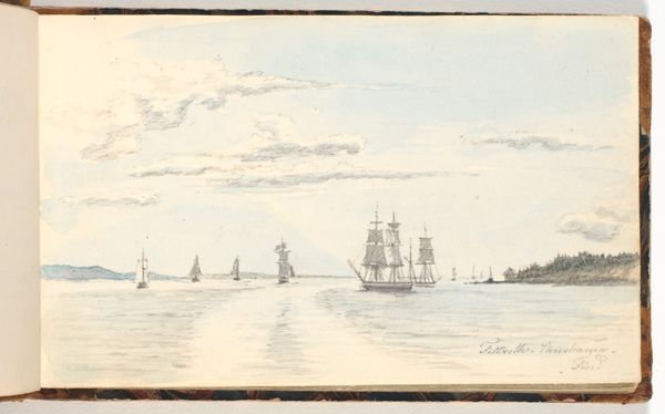 Curator: Martinus Rørbye’s “Skærgårdslandskab,” dating to 1832, offers a tranquil glimpse into the Scandinavian archipelago. It’s currently held at the SMK, the National Gallery of Denmark. Editor: It's almost ghostly. The muted palette and sparse details evoke a profound sense of stillness, a breath held in time. Curator: Indeed. Rørbye masterfully employs a limited tonal range—primarily ink, watercolor and pencil—to convey depth and atmosphere. Notice how the horizon line, placed almost at the center, divides the composition, creating two distinct zones, which interact to achieve balance. Editor: The ship, positioned centrally, functions almost as a mediator between those zones. Ships have always served as potent symbols—bridges between the known and unknown, the self and the other, trade and exploration... even conquest. What do you read into its presence here? Curator: Precisely! While the iconography is important, let's consider the line itself. The delicate, almost hesitant, strokes of the pencil that define the vessel contrast sharply with the broader washes used for the water and sky. The difference serves to concentrate attention and suggest the tension in the pictorial space. Editor: I can also not help but notice that there's a certain quiet melancholy inherent in Romanticism of this period. This landscape seems imbued with a sense of longing for something just out of reach, don’t you think? Perhaps the exotic locales he'd later visit... Curator: A pertinent observation. In that sense, the image transcends pure representation, operating instead at the symbolic level as it speaks to themes of human aspiration. Editor: Ultimately, Rørbye gives us not just a landscape but an invitation to pause, reflect, and consider our relationship with the world and the narratives it silently whispers to us across the ages. Curator: Yes, and considering its careful composition and tonal balance, what seems a simple sketch possesses formal intricacies that prompt us to question how understated beauty might often mask structural virtuosity.
