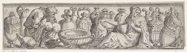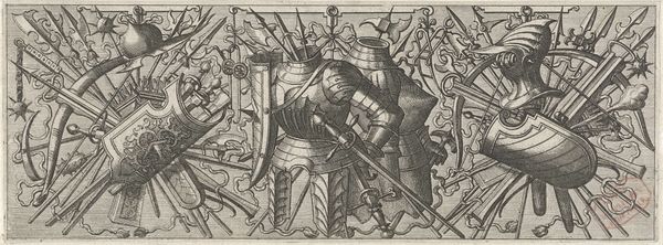 Curator: What a fascinating image! We’re looking at "Fries met wapens, een geboeide man (krijgsgevangene of slaafgemaakte) en twee oosterse figuren," an engraving attributed to Odoardo Fialetti, dating from 1583 to 1638, currently residing at the Rijksmuseum. Editor: It strikes me as rather chaotic at first glance. A jumble of forms, seemingly competing for attention within a tightly confined space. Curator: Indeed. These “trophies,” or heaps of arms, signify power, dominance. But it’s not straightforward glory. See how the central figure, the bound man, acts as a reminder of conquest’s human cost. These arrangements, popularized during the Renaissance and Baroque periods, celebrated military triumph while, implicitly, acknowledging its consequences. The inclusion of figures perceived as "oriental" at the time layers on themes of cultural conflict and the "other." Editor: I’m intrigued by the linear precision. The engraver's skill renders these objects with sharp detail, almost fetishizing them. The lines define the texture of the metal, the folds of fabric... each component, distinct, yet crammed together, produces an uneasy harmony, a decorative order imposed on violent themes. Curator: Precisely. Think of these lines as chains too, both aesthetically holding the piece together and conceptually linking motifs of war and its human cost. The piece reflects an established tradition that presents conquest, and by extension, violence, within a controlled aesthetic framework, attempting to impose order on chaos. Editor: Yet that "control," I would argue, highlights its opposite. The composition almost feels on the verge of collapse, the arrangement so dense that it threatens to spill over. It is within this tension between meticulous execution and latent chaos that the artwork gains its force. Curator: The artist uses a formalized, symbolic language here, one easily legible to its original audience, speaking volumes about cultural perceptions of power and the subjugated other. It asks: how do we frame victory when it's intrinsically linked to suffering? Editor: I agree. And for me, the lasting impact lies in the technical mastery coupled with that compositional anxiety. A stunning example of how form and content can complicate one another. Curator: Absolutely. By delving into its imagery and history, we unearth layers of cultural narratives embedded in its linear details.