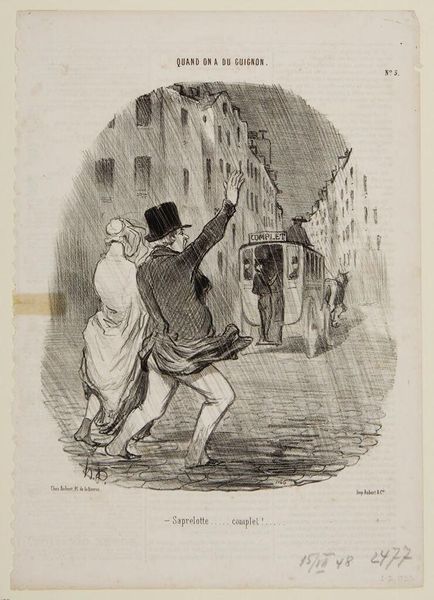 Curator: This lithograph by Honoré Daumier, titled "Let's go...let's go, little one, who says he has a tummy-ache!", strikes me as quite poignant. The stark contrasts and hurried lines convey a sense of urgency. Editor: Indeed. The subject matter is really intriguing. Daumier was masterful at depicting the material realities of 19th-century French society, like the burdens and daily dramas of family life for these bourgeois figures. Curator: Precisely! The father's attire versus the implied ailment of the child presents a fascinating material contradiction, doesn't it? How does societal expectation weigh against individual suffering? Editor: It's fascinating how Daumier uses the relatively new medium of lithography to capture and comment on social behaviors and class structures. He's really using art as a mirror to the politics of everyday life. Curator: I find that exploration of societal pressures within the domestic sphere so very relevant, even now. Editor: Yes, it leaves you contemplating who has the real “tummy-ache” in this scenario.