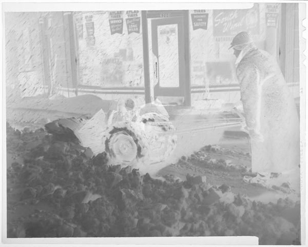 Curator: This is an untitled work by Jack Gould, held here at the Harvard Art Museums. It's a compact gelatin silver print, depicting a man with piles of laundry. Editor: Bleak, industrial. It’s all grays and stark lighting, those huge piles of cloth kind of swallowing the scene. Makes you feel… heavy. Curator: Indeed. Gould's work often presents these unvarnished glimpses into working life, exploring themes of labor and routine through a very humanistic lens. Editor: It almost feels like a staged tableau, but there's a rawness to it, a lack of romanticizing the working class, which feels quite modern. Curator: I agree. It’s a powerful study of place and the people within it. Editor: Definitely offers a unique perspective on labor and the environment, really makes you think about the untold stories held within these spaces.