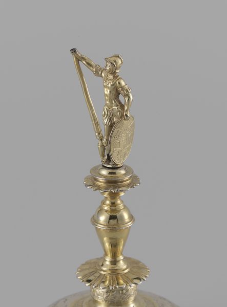 Curator: Oh, my, the sheer density of detail is immediately overwhelming! It almost vibrates with ornate complexity. Editor: Indeed. We’re looking at what's known as the “Masterpiece cup and cover” by Johann Friedrich Baer, crafted in 1746. You can find it here at the Minneapolis Institute of Art. It's a dazzling example of Baroque silver work. Curator: Baroque, absolutely. You see it in that exuberant layering. All that texture created with the carving of silver—what stories do you see emerging from the decoration? Editor: Well, on the cup's base, bacchanalian figures hint at celebration and earthly pleasures. The central portion of the cup seems to depict scenes of mythology perhaps related to triumph and virtue while above that, right there at the top stands a heroic figure, likely Hercules himself, in triumphant pose, club raised, a defeated Cerberus, the hound of Hades, at his feet. Curator: It feels overtly celebratory but the mastery of composition, that tension between density and dynamism – it really draws you in. How does the material itself inform its function in society? Editor: Pieces like this were essentially demonstrations of status and skill. They were meant to impress, displaying wealth, knowledge, and power during elaborate feasts or diplomatic gatherings. Silver, of course, was highly valued, a tangible signifier of affluence, making ownership of such items deeply connected to privilege and social authority. These types of art pieces were statements of wealth and refined taste during the Baroque era. Curator: And Baer, through his technical prowess, really delivers that statement, doesn’t he? The reflections play off those high and low reliefs to make something of striking theatricality, even now. I almost feel I need to be wearing a powdered wig just to properly appreciate it. Editor: (laughs) Perhaps a viewing party is in order. Still, beyond social considerations, Baer has crafted something quite compelling formally. It strikes me as more than just wealth—but artistic expression, even bordering on sculpture, where function becomes secondary. Curator: Precisely! The way meaning and art collide so powerfully and so visibly here tells us as much about society as it does the artist. Editor: A glittering testament, if I may say, to the enduring power of visual spectacle.