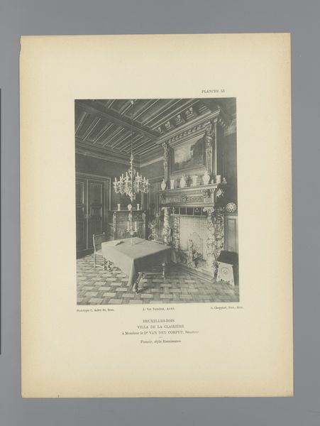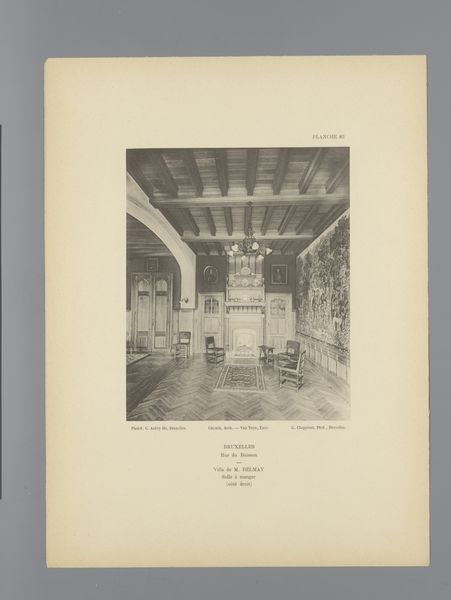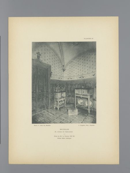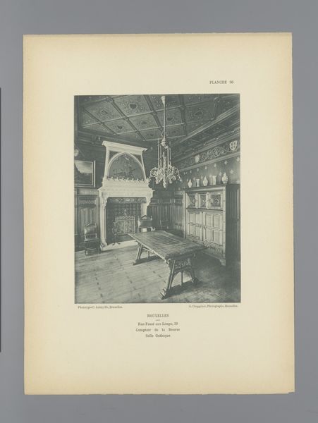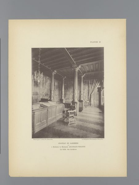 Curator: This work, an earlier example of architectural photography before 1898, is entitled "View of a Staircase in Gaasbeek Castle, Belgium" attributed to G. Choppinet. It's presented as a black and white print, capturing a rather gothic looking interior. What’s your initial read? Editor: My first impression is one of stillness and muted grandeur. The grayscale rendering adds to this solemn, almost melancholic feel. I'm drawn to the repetitive vertical lines, they’re oddly calming, creating a sense of measured ascension. Curator: Indeed. The print itself highlights certain socio-political aspects linked with castles at the end of the 19th century. Castles, after having lost their defensive importance, underwent heavy renovations to present the nobility as relevant again in public perception and photography was used as a popular mass media. This specific angle emphasizes the staircase. It subtly suggests the architecture and inhabitants had to go upwards to climb in society, thus recreating the noble lifestyle. Editor: That's interesting, particularly considering the symmetrical composition, reinforcing the idea of ascending to power, as you mention. Note how the lines and stonework funnel the eye upwards, while the statue of what looks like a knight remains fixed at the bottom, almost guarding the base of social mobility. I'd say, regarding purely formal analysis, the composition cleverly reinforces your point regarding hierarchical ascendance. Curator: Precisely. Now, regarding materials, let’s look at how print itself—as a reproducible medium— democratized access to these exclusive spaces and architectural marvels like this castle. This photo made formerly inaccessible spaces available for scrutiny by any member of the public, indirectly suggesting an element of transparency to the feudal system. Editor: It seems a kind of propaganda in print, showcasing stability and power as pillars of society by literally exhibiting stone pillars that compose the castle itself. The absence of vibrant colors renders the social message even more monolithic. Even so, in some instances, the photograph shows wear, signifying age. This subtly contradicts its goal of appearing like the first building stones have just been laid. Curator: Yes, the aesthetic choice does play a role and can also signify that while old, its importance to the fabric of the nation still holds, but time and society waits for no castle. It appears these points clash as this artwork presents an interesting oxymoron. It serves both political parties in various ways: It can subtly promote a political structure and at the same time, the passage of time denotes change which in return supports more liberal standpoints. Editor: I've become very attentive to how Choppinet's formal construction of the image conveys symbolic importance that would potentially appeal to every political stance and ideology, as we’ve observed. A fascinating play on public memory and visibility.