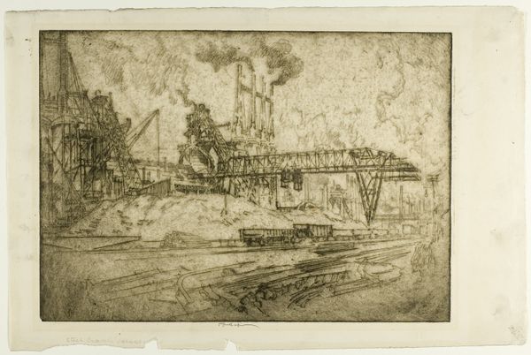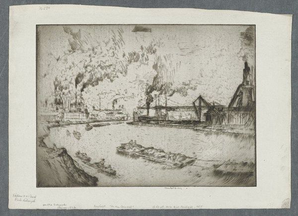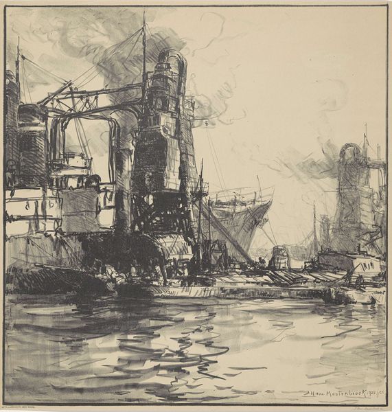 Editor: Here we have Johan Hendrik van Mastenbroek's "View of the Port of Rotterdam, with Several Cranes," an etching and print from 1906 currently residing in the Rijksmuseum. I'm immediately struck by the sheer industriousness depicted. How do you see this work in relation to the social and economic context of the time? Curator: It's important to remember that in 1906, Rotterdam was experiencing massive growth, driven by its port. This etching captures that explosive period. We're not just seeing ships and cranes; we’re seeing the engine of a burgeoning global economy. Consider how such scenes were presented and consumed: prints like this would have been circulated, reinforcing the idea of progress and Rotterdam’s importance within the expanding modern world. Do you think this is simply a neutral observation, or does it celebrate something? Editor: That’s a really insightful point! It definitely feels like a celebration, a depiction of human mastery over industry. The detail lavished on the cranes and ships gives them a sense of power and presence, not as a grim industrial landscape but as symbols of triumph. Curator: Exactly. The politics of imagery come into play. This isn’t some stark depiction of worker exploitation – although that was surely present. Instead, it’s about projecting an image of modernity, prosperity, and national pride. Ask yourself, whose narrative is being prioritized here and how might it mask other truths about this moment in history? Editor: I see what you mean. It really makes you question what’s absent from the image. All that focus on industry overshadows the individuals involved in that intense labor. It offers a grand view that obscures the lives behind it. Curator: Precisely! Thinking about the purpose and cultural context reframes our viewing experience. Editor: It really does. I’ll never look at an industrial landscape the same way. Thanks! Curator: My pleasure. It's vital to analyze these artworks as cultural artifacts.