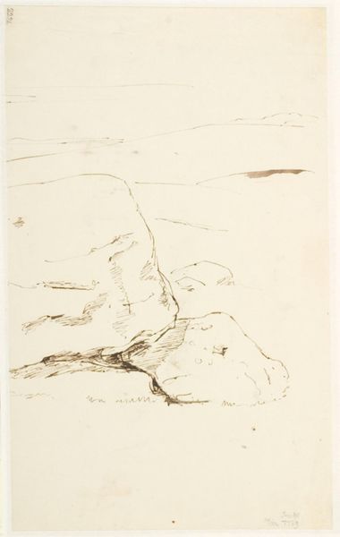 Editor: Here we have Dankvart Dreyer's "Brudstykke af kæmpehøj på Brandsø," an ink drawing from 1842. It's a quick sketch, almost ghostly. What strikes me is the starkness of the landscape. What do you see in this piece? Curator: It's interesting that you say "ghostly." Look at how Dreyer uses the ink not just to depict, but to evoke. The landscape itself becomes a canvas for memory. Do you see how the burial mound dominates the foreground? For me, it’s not merely a geographical feature but a powerful symbol. Editor: Of what? Curator: Of the past, of course. The Danish title translates to "Fragment of a Giant's Mound on Brandsø." Mounds like these were perceived in the Romantic era as tangible links to a heroic, mythical past, and even stand for a sort of "origin" of the Danish people. In its lines, this drawing recalls ancient sagas, lost battles, and the enduring spirit of a culture. What emotions does this symbolism awaken in you? Editor: A sense of reverence, definitely. Like I'm peering into a history book, but one written in earth and ink, instead of words. There is so much light in the background. How do you read that? Curator: The light breaking on the horizon suggests not only the physical dawning of a new day but also the potential rediscovery of the nation’s cultural memory. The choice of ink amplifies that feeling - a wash over of something lost, or nearly forgotten. Editor: I never considered how literally the materials could reflect the meaning. Thank you for pointing that out. Curator: It all speaks to how artists like Dreyer infused their landscapes with deep cultural and psychological significance. These aren't just pretty pictures; they're vessels carrying stories across time.