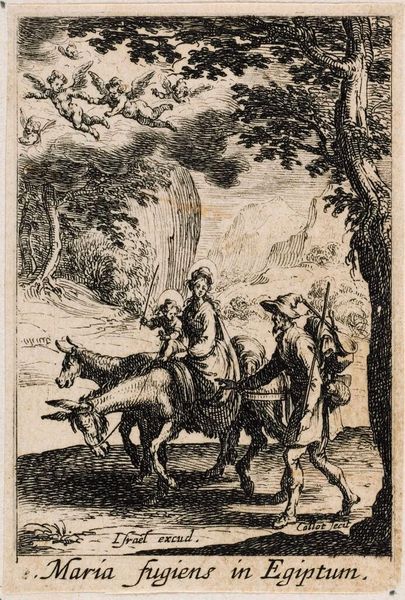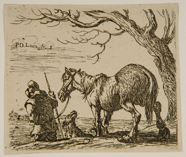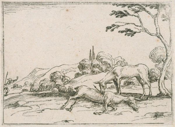 Editor: So, here we have Allart van Everdingen’s engraving, "Ram with bundle on his back leads Reynard towards town." It feels like a fable, doesn't it? What do you make of this curious trio, this ram, fox and bundle, heading towards the town? Curator: It’s wonderfully odd, isn’t it? Immediately, I think of Aesop and those old tales where animals reveal human truths. Van Everdingen gives us this bucolic scene, but there’s a definite tension. The fox, Reynard, is famously sly, so what’s in that bundle? And why is the ram so willing? Are we seeing innocence, or perhaps foolishness, being led astray? Editor: It's interesting you say that. I was thinking maybe the ram isn't so innocent. What if the bundle is something stolen? Curator: Oh, I love that! Suddenly, the whole dynamic shifts. This piece makes you wonder, doesn’t it, about the stories we tell ourselves and the motives hidden just beneath the surface. Editor: Absolutely! This piece definitely has a way of igniting the imagination.
