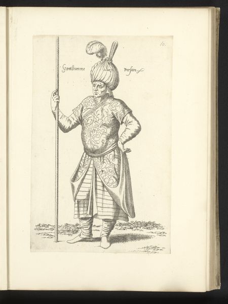 Editor: Here we have Wenceslaus Hollar's 1645 engraving, "Unus Americanus ex Virginia," or "An American from Virginia." The man depicted appears young, perhaps in his early twenties, adorned with striking jewelry and a unique hairstyle. It’s a surprisingly intimate portrayal. What do you see in this piece, particularly given its historical context? Curator: Hollar’s work is steeped in the symbolism of encounter and representation. Notice how the sitter is meticulously adorned, the details of his jewelry and hairstyle carefully rendered. Consider how Hollar, a European artist, chose to portray this "American." What aspects did he emphasize, and what might he have overlooked or perhaps misunderstood? The face-on representation lends a feeling of objective reportage. What elements feel like an outsider's observations, rather than insider knowledge? Editor: I hadn't thought about the outsider's perspective so explicitly. The emphasis on the details of his ornamentation now strikes me as almost anthropological. It feels like a cataloguing of otherness. Curator: Precisely. And what about the inscription, "aetat 23"? That age marker adds a layer of specificity, but does it individualize him or further categorize him? The choice of Latin for the inscription also sets the subject apart, because Latin was a language of education, used across Europe by scholars, and perhaps, even colonial officials. Editor: So, in essence, it simultaneously identifies and objectifies? I see that tension now. It is no longer just a face from the past but also carries heavy connotations of that initial cultural meeting, full of wonder, but also, unequal power dynamics. Curator: Exactly. Art is, after all, a record of who does the seeing and who is being seen, across time.