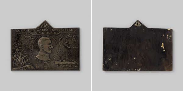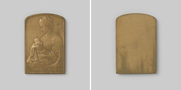Curator: Today we are looking at Cornelis L.J. Begeer’s 1905 bronze relief titled "Maria de Man vijfentwintig jaar numismate.” Editor: My first impression is that of a study in quiet dignity; the subdued color palette and restrained detail give it a very composed feel. Curator: Begeer's style is heavily influenced by Art Nouveau and academic art, visible here in the decorative elements surrounding Maria's profile. Her stern and rather stoic composure is highlighted through this formalist technique. I notice how the precise linearity almost isolates the subject, giving off an essence of unapproachability. Editor: It is also interesting to reflect on the subject: a woman recognized for twenty-five years of accomplishment in the traditionally male-dominated field of numismatics. This representation underscores her pioneering role. Curator: The choice of bronze further contributes to this perception, doesn't it? The coolness and weight of the material imbue the subject with importance and longevity. In considering her accomplishments, is the artist hinting that this role in the numismatics is more than just a profession? Perhaps it is now part of Maria's established identity? Editor: And, what does it say about us today, viewing this representation over a century later? I wonder if a female numismatist is still met with curiosity and even mild suspicion? Has Maria's perseverance helped other women make their mark? Curator: These are significant considerations to keep in mind as we consider the relief's layered commentary. It is interesting how a formalist approach and more political vantage can both come to similar insights on legacy and meaning making. Editor: Indeed. Art like this creates conversations, compelling us to think beyond the surface and ponder larger questions about gender and representation in both historical and contemporary terms.