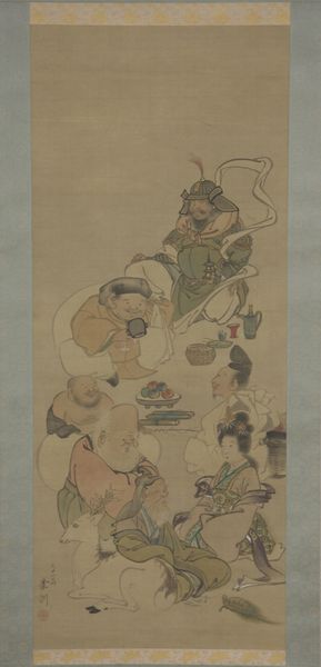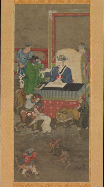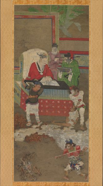 Editor: Here we have "Ten Kings of Hell," painted between 1167 and 1194 by Jin Chushi. It's an ink and tempera on silk piece hanging here at the Met. Initially, I’m struck by the formality and the horror blended together; the central figure looks like he’s in court, but then there are these disturbing figures all around. What do you see in this work? Curator: It’s a powerful example of how symbols shape our understanding of complex themes. Note how the central king is framed by architectural motifs—they establish his authority, reflecting the earthly courts. Yet, the demonic figures and the tormented souls break that structure, revealing what happens if earthly laws are not obeyed. It pulls from Buddhism, folk religion and confucianism and that tells us that this piece carried so many cultural values. What about the colors and composition; what do they evoke for you? Editor: The red is striking. I guess that pulls the eye and the weight downwards, towards those ghostly figures. Is that a conscious thing? Curator: Absolutely. Red traditionally symbolizes good fortune and power in Chinese culture, and notice it's used for the king and his attendants; the visual system reinforces a system of status. That vividness also creates contrast with the pallid tones of the suffering souls, and in terms of psychological weight, red often evokes heightened emotion. Think about that for a second - does your personal understanding shift? Editor: It does, a bit. It seems less like a distant, abstract judgment and more immediate, even emotional. Curator: Precisely. That visual and emotional tension serves a didactic function, reinforcing moral values. By the way, do you see something specific that calls your attention in the monster imagery? Editor: Hmm... Maybe that figure with the sword in the bottom left, riding a serpent? Curator: Interesting. I would explore how serpents play into hell imagery, how snakes function as the embodiment of disorder and death, and by placing the defender on this serpent the painter communicates the necessity of evil or even punishment. Editor: That’s really fascinating; looking closer at the symbology has revealed this whole additional layer about control. Curator: Yes, art offers continuity. These paintings aren't static depictions of the past. Instead they offer symbols that evolve, reminding us that art invites conversations that never end.