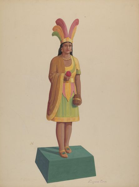 Eugene Croe made this striking ‘Cigar Store Indian’ painting with watercolor. It’s the kind of piece where the making is pretty visible - you can see the handiwork in the careful, even strokes and the deliberate layering of color. Looking at this, I’m drawn to how the colors are both flat and kinda rich at the same time. There’s this red that feels like it’s trying to be a fancy royal color, but it’s also a bit...off. It’s the way the layers of color sit on the surface that makes it pop. Take the small details, like the feathers on the figure's head. Each stroke feels intentional, almost reverential, adding a layer of depth. It's not unlike some of Alex Katz's early flat paintings, they share a similar sense of color and form. But where Katz seeks flatness, Croe finds depth. This piece is so captivating because it embraces ambiguity and invites us to see art as an ongoing dialogue.