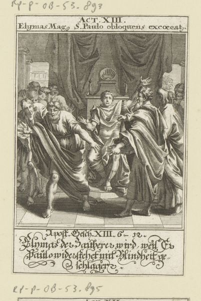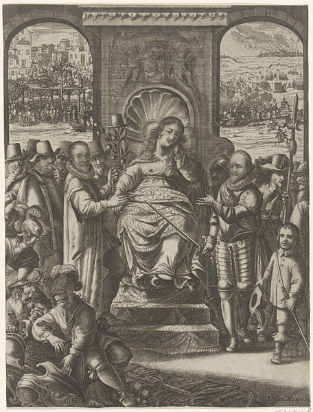 Editor: So this engraving, "Hollandse Maagd en vijf prinsen van Oranje," made around 1664, feels like a stage production. It's stiff and posed, yet filled with symbolic elements I'm probably missing. How do you interpret this work? Curator: Well, what jumps out to me is how it draws upon a visual language steeped in cultural memory. This "Hollandse Maagd," the Dutch Maiden, is a personification of the Netherlands, right? Note her central position, almost iconic. But what does she represent, flanked by these figures? Editor: I see she is surrounded by soldiers in armour, and holding an olive branch? Curator: Precisely. Think about the symbols – the olive branch as a sign of peace, contrasting with the military attire and raised sword. It suggests more than just historical record. It speaks to a specific understanding of Dutch identity and leadership, particularly after decades of war. Where does your eye travel after seeing those symbols? Editor: Upward, I suppose, to the hand holding the sword? Curator: Note the hat on a pole as well: these gestures draw on visual tropes designed to instantly trigger ideas of liberty, power, and perhaps even divine favour, which must have resonated strongly with contemporary viewers. But how do these elements, especially the 'Maagd,' affect its psychological weight, even today? Editor: So it's about understanding the symbolic context, seeing how these images were designed to evoke feelings of national pride. I guess that helps decode its deeper meanings. Curator: Indeed. The engraving serves as a lens into 17th-century Dutch self-perception, its historical anxieties and aspirations projected onto this very carefully constructed image. It makes you consider how we still create similar visual narratives about ourselves today. Editor: Thanks, seeing how potent visual language was, and still is, helps so much!