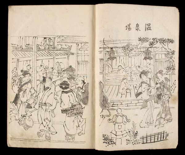 Editor: So, this is “Souvenir of Edo, vol. 6”, created sometime between 1850 and 1853 by Utagawa Hiroshige. It’s an illustrated book, a woodblock print using ink on paper. Looking at this image of a bustling street, I’m struck by the contrast between the rigid architectural lines and the seemingly chaotic crowd. What historical insights does this work offer? Curator: This Ukiyo-e print offers a glimpse into Edo period urban life, especially the commodification of everyday experiences through the souvenir album format. Note how the high vantage point and linear perspective were utilized to flatten social hierarchy. Hiroshige does this by emphasizing the density and constructed environment, and how it controls its inhabitants. Are we looking at an idealized, commercial representation, or does this image reflect real societal power dynamics of the time? Editor: That's a really interesting point. The repetition of architectural structures does make the people seem small and insignificant. So, this print, seemingly documenting a common street scene, participates in reinforcing social structures through visual means? Curator: Precisely. Think about who was commissioning and consuming these souvenir albums. Were they meant for local consumption or to present a specific image of Edo to outsiders? Consider how this contrasts with more critical depictions of social unrest that emerged during the same period. Editor: This totally reframes how I see it. Initially, it just looked like a snapshot of daily life, but now it appears to be carefully constructed image promoting Edo, both celebrating and masking the social realities of the time. Curator: Yes, the politics of imagery is central to Ukiyo-e’s role in shaping and disseminating perceptions of Edo society, its class structures and power. It makes me question how the representation of public life shapes collective identity. Editor: Thanks, I hadn't thought about it that way before, how art can both reflect and manipulate social perceptions. Curator: Indeed. Thinking critically about an artwork's public role in shaping the socio-political views of people is central to historicizing art.