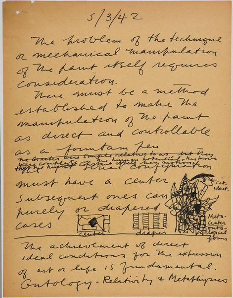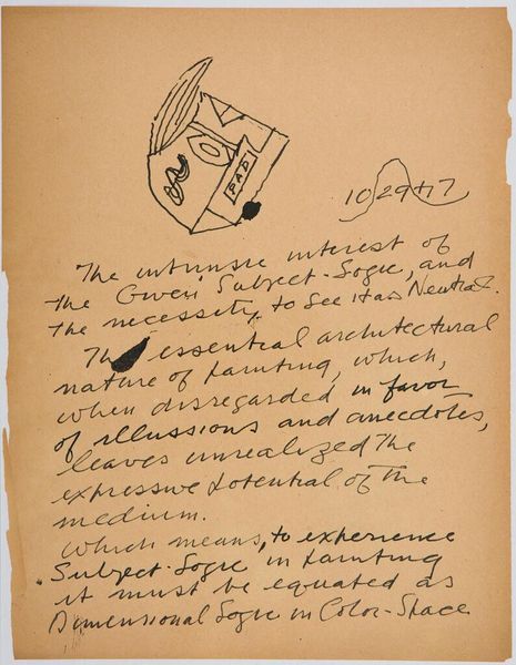 Editor: This is Stuart Davis's "Art Theory Text with Abuttal Diagram," a work on paper at the Harvard Art Museums. It feels like a glimpse into the artist's thought process, with the diagram and handwritten notes. What do you see in this piece? Curator: I see a critical questioning of artistic conventions and an exploration of visual language. Davis, deeply engaged with socialist politics, often challenged established hierarchies. This piece seems to deconstruct traditional notions of form, asking us to reconsider how "relations" – be they visual or social – are perceived and valued. How might this relate to his broader socio-political views? Editor: So, the "undeveloped N relations" could represent marginalized perspectives? Curator: Precisely. Davis invites us to interrogate the power dynamics inherent in visual representation, mirroring societal structures. The "sizeless C" could even symbolize a fluidity of identity, resisting rigid categorization. What does that make you think about, in relation to how our contemporary society engages with identity? Editor: It's like he's advocating for a constant re-evaluation, both in art and society. Curator: Exactly. And it's a reminder that art can be a powerful tool for social commentary and change.