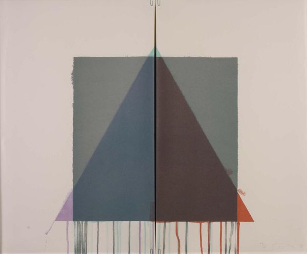 Editor: This is Paul Huxley's *Untitled XII 18*, relating to *Double Image 1982*, housed at the Tate. It's striking how the severe geometric forms on the left clash with the pastel chaos on the right. What do you see in this piece? Curator: I see a fascinating tension, not just in the forms, but perhaps a reflection of societal dualities. The "severe geometric forms" could be interpreted as representing rigid structures, perhaps patriarchal norms, while the "pastel chaos" might symbolize the fluidity and disruption of those norms by marginalized voices. How does that strike you? Editor: I hadn't considered that contrast in that way, but I see what you mean. The almost aggressive shapes on the left, set against the softer, layered forms, definitely speaks to conflict. Curator: Precisely. And the dialogue between the two sides isn’t resolved, is it? It's a potent visual representation of the ongoing struggle for equality and recognition. It makes me think about how we can challenge existing power structures. Editor: I'll never look at geometric abstraction the same way again! Curator: Nor will I. It's a reminder that art is never truly "abstract"—it's always embedded in a social and historical context.