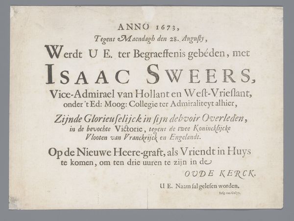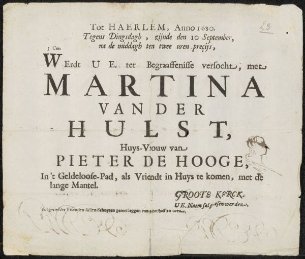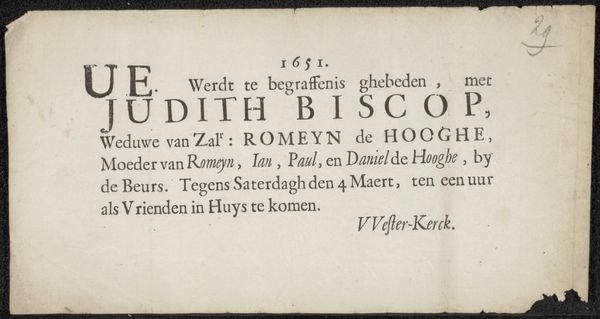 This is an invitation printed in 1684 by H. Magnus, inviting Romeyn de Hooghe to the funeral of Josina de Hooghe. As a seemingly simple announcement, this print is a fascinating document of social norms in the Dutch Republic. The careful typography speaks to the formal nature of social relationships in the 17th century. The invitation hints at the status of the deceased and her family, referencing her husband Jacob ten Grootenhuys’s civic position and the location of the service at the Zuiderkerk. Romeyn de Hooghe, the invitee, was himself a prominent and prolific artist. His presence would have been a significant honor. Understanding the culture of early modern Europe requires a close examination of printed matter like this, using resources such as genealogical records, municipal archives, and collections of engravings. The social life of art, like the lives of people, lies in the details.