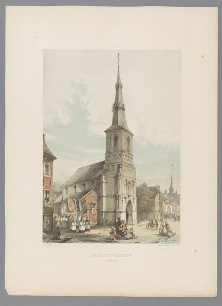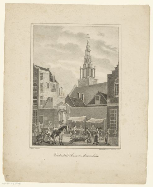 This is an undated rendering in ink and watercolour by an anonymous artist, depicting a view of the Zuiderkerkstoren in Amsterdam. The composition is structured around the imposing verticality of the church tower, which dominates the skyline, contrasted by the horizontal sprawl of the marketplace below. The muted palette of greys and browns lends a sense of understated realism, inviting scrutiny of the spatial relations within the scene. Observe how the artist employs linear perspective to draw the eye upward, emphasizing the tower's height and its architectural details. The tower's spire, piercing the sky, acts as a signifier of both spiritual aspiration and civic order. The marketplace, teeming with figures, introduces a layer of semiotic complexity. These individuals, engaged in commerce and daily life, embody the dynamic energy of the city. This artwork provides us with a meditation on the interplay between the sacred and the secular, the vertical and the horizontal, inviting us to consider how such visual structures shape our understanding of urban life and the values it embodies.