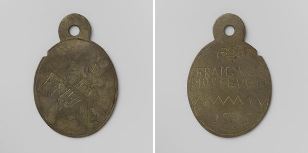 Editor: So, here we have the guild badge, dating back to 1789, of Jan van Summeren, from the guild of timbermen, masons, plumbers, stonecutters, and pavers of 's-Hertogenbosch. It looks like it’s made from some kind of metal, possibly brass. It feels very... utilitarian. What can you tell me about it? Curator: This piece is fascinating from a materialist perspective. We see here not just an art object, but a relic of labor. The materials themselves – brass, likely locally sourced – speak to the economic realities of craft production in the late 18th century. How do you think the design was physically realized on the metal? Editor: It looks like etching, perhaps? Curator: Exactly! Think about the skilled labor involved: the cutting of the die, the precise etching…and consider the guild itself. Guilds controlled not only production but also training and the market. How does understanding the social context, this framework of artisan labor and localized economies, change how you perceive the object itself? Editor: It makes me consider who was wearing it, what was it made of, who it was accessible to... almost like the working-class version of wearing a coat of arms, as a symbol of status in society. Curator: Precisely. The choice of materials, the manufacturing process, all are infused with socio-economic meaning, moving this beyond simply a decorative object to a document of working lives and the societal structures around its makers. Editor: That's a powerful idea, I've never looked at art from this point of view! I'll definitely be considering materials in a different light from now on!