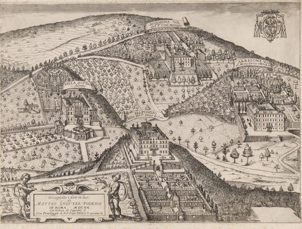 Johann Friedrich Leonard made this print, titled "View of Froidmont Castle", sometime in the 17th century. We see the castle in the context of its wider estate; the artist aims to show not just the castle, but the land and the properties that surround and support it. The vantage point and style are interesting here. It's not quite a bird's eye view, but the artist elevates us to see the castle and the surrounding landscape. It gives us a sense of the wealth and power of the castle's owners and perhaps gives us a clue as to why these kinds of images were commissioned. This aesthetic was popular in the Netherlands and wider Europe, for wealthy landowners and those who wished to display their assets. Notice the escutcheons with heraldic emblems in the upper corners, and consider their symbolic function in communicating status. Historians look to images like this alongside estate records, tax documents, and family histories, in order to get a fuller picture of the socio-economic structures of the time. What does the image tell us, and what does it conceal?