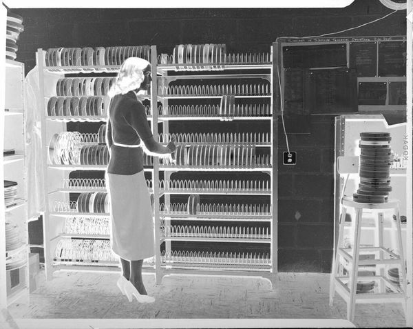 Curator: This gelatin silver print by Peter James Studio shows two people amidst towering library stacks. The composition, at first glance, feels overwhelming. Editor: Indeed, the sheer repetition of forms creates a powerful sense of scale and almost oppressive accumulation. The grayscale tones further enhance its feeling of starkness. Curator: The image presents an intriguing contrast: a woman meticulously examining a book, juxtaposed with a man reaching for something high on a ladder. Their interaction, or lack thereof, draws the eye. Is it an image of class? Labor? Leisure? Editor: Perhaps it reveals the performative aspect of knowledge acquisition. Consider how libraries historically functioned as institutions of power, shaping narratives and determining access. Curator: The meticulous arrangement of the stacks creates a rigid grid that entraps its inhabitants, but I'm struck by the tonal balance: the light clothing versus the darker shelves... Editor: And the interplay of public versus private space... Interesting.