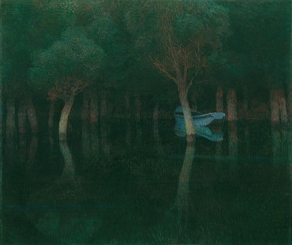 Jozsef Rippl-Ronai captured this park at night with oil on cardboard, creating a nocturnal scene dominated by blues and greens. The composition is structured around vertical tree trunks that punctuate the deep, enveloping darkness. A solitary lamp emits a warm, yellow glow, contrasting with the cool tones and casting long shadows that distort the space. Rippl-Ronai's approach simplifies forms to their essential shapes, reflecting a move toward abstraction. The overall effect is dreamlike. The semiotic interplay between light and shadow is striking. The bright lamp symbolizes clarity against the obscurity of night, mirroring a philosophical tension between knowledge and the unknown. The dark palette challenges traditional notions of beauty, pushing viewers to find elegance in what is hidden. Note the texture created by the visible brushstrokes; they animate the canvas. They emphasize the materiality of the paint and suggest the transience of the moment. Rippl-Ronai invites us to consider how light and darkness, form and void, shape our understanding of the world.