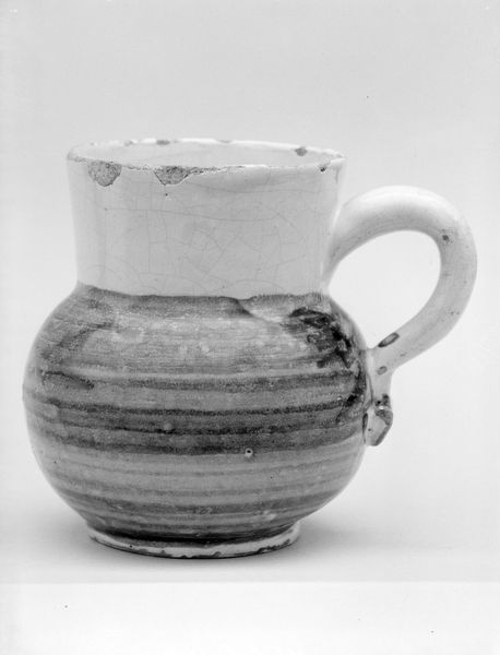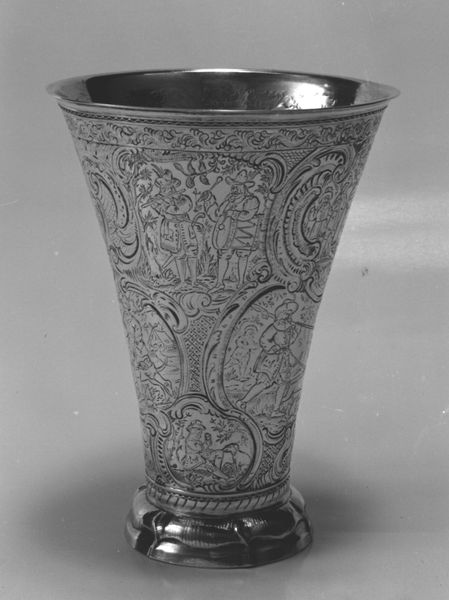 Curator: Alright, let’s turn our attention to this piece. What we have here is a jug crafted from silver around 1577-1578, currently residing here at The Met. Editor: Wow, instantly, I'm struck by how imposing yet ornate it is! There's this rough, hammered texture across the body contrasting with delicate floral patterns near the lid. It's a bit of a head-scratcher; opulent but in a rather edgy way. Curator: Precisely! The hammered surface is a fascinating detail. It creates this contrast, this play of light and shadow, adding to the depth of the piece. Then we see how it graduates to smoother, more intricate designs toward the top. The iconography certainly hints at prosperity and abundance, but there is the overall impression of weight...literally! Editor: It definitely feels hefty, doesn't it? I can just imagine the sheer labor and time involved in hammering all that silver. And I love the juxtaposition of the ornate embellishments on the top—almost frivolous—and this brutal texture across the lower half. To me, it expresses both refinement and pure, unadulterated human toil! A statement, maybe, on society’s foundations? Curator: Interesting observation! During this period, vessels like these often carried layers of symbolic meaning far beyond their utility. Flowers symbolized regeneration, while other images could denote status, familial history, or even personal aspirations. This was created by William Cockinidge, we are seeing that decorative art becomes intertwined with social communication. Editor: Thinking about it in today’s context, this object transcends time; it speaks of effort, beauty born from struggle, and hidden histories. One glance unlocks conversations about class, craft, the weight of the past… You could write a novel just based on this vessel! Curator: Absolutely. I encourage our listeners to really spend some time considering its details, its textures, and the stories it subtly conveys. You'll discover even more complex impressions over time, as I have for many years! Editor: I am sure that everyone can admire what you see here – literally - but what you will truly admire will take a few thoughtful minutes... I really enjoy that and invite everybody to discover what might speak to them through the history this remarkable jug encapsulates.