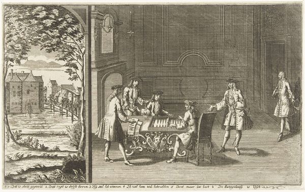 Editor: This is "Mænd, der ryger tobak," created sometime between 1705 and 1777. It’s an engraving. It's very detailed, a snapshot of a group of men enjoying tobacco in what looks like a garden setting. What strikes you about this print? Curator: It speaks volumes about cultural rituals. Notice the communal aspect. Tobacco isn't merely consumed; it's a social lubricant, almost a sacrament performed in this gathering. See how the smoke curls upwards, echoing the domed structure behind them? What might that connection imply, do you think? Editor: Maybe it represents elevating the mind? I guess the text underneath hints at that too? Curator: Precisely. The smoke, a visual motif throughout the print, becomes a symbol. It suggests contemplation, shared ideas… perhaps even a deliberate effort to transcend everyday concerns within the hallowed space they've created. How do you interpret the men's expressions, particularly the one pointing? Editor: He looks like he's making a pronouncement, almost lecturing. Perhaps he's the designated "sage" of the group, elevated by the tobacco and ready to share his wisdom? It seems like a very performative gathering. Curator: Yes! The setting also helps, and the careful arrangement implies something deliberate, considered. Their attire, the architecture… These are cues that hint at a performance of social standing and intellectual exchange, reinforced by this shared ritual. It connects us to a time where contemplation was both a personal and collective pursuit. Editor: I never considered tobacco as such a culturally loaded symbol! This engraving offers more than meets the eye. Curator: Indeed. It's a window into how societies imbue objects and activities with meaning, creating layers of cultural significance.
