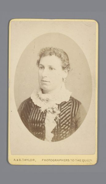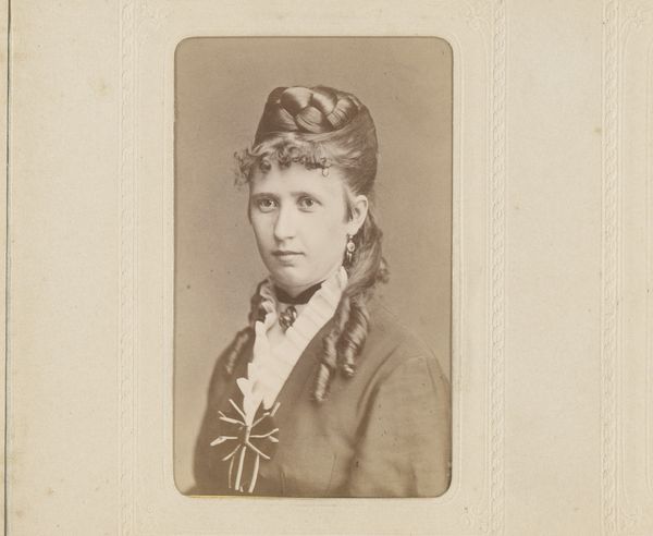 This is a photograph of an unknown woman by Hermanus Jodocus Weesing. The sepia tones lend a sense of nostalgia, framing the subject in a soft, diffused light, enclosed in an oval format. The woman's pose, combined with the tight framing, evokes a feeling of intimacy and reserve. The composition is structured by the contrast between the soft curves of her dress and hair, against the geometric rigidity of the frame itself. The ruffled details and lace collar, rendered with precision, invite close inspection, yet the subject’s gaze remains elusive. The photograph captures a moment suspended in time. The choice of sepia tones suggests an engagement with memory, while the careful arrangement of the subject within the frame speaks to the formal constraints and aesthetic considerations of the photographic medium. It invites us to consider how identity is constructed through both absence and presence, and to reflect on the complexities of representation.