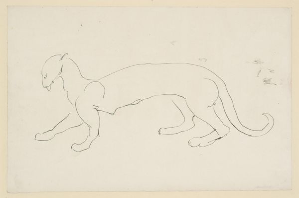 Editor: We're looking at "Panther Prowling" by Edvard Munch, created in 1911, an ink drawing or print. I’m struck by its raw energy; it feels both powerful and vulnerable. What leaps out at you when you see this, our resident wise owl of art? Curator: Oh, that's a juicy question! For me, this image encapsulates the very essence of instinct. See how Munch uses such incredibly stark, almost frantic lines? It's like the panther is barely contained within the frame, ready to spring out with an explosive snarl. Imagine that tension, that internal conflict between power and the desire for release – isn't that a delicious bit of chaos? It reminds me of when I try to follow a recipe exactly, but then just fling in a handful of paprika for kicks. Editor: It does feel restless. The panther's form seems both defined and dissolving, like a phantom. Do you think that captures a feeling, like anxiety, rather than just describing an animal? Curator: Absolutely! It's a projection, isn't it? A tangible representation of some internal state. Remember Munch was wrestling with some heavy-duty mental landscapes at the time. This isn't just a panther, it’s *his* panther: the untamed, primal force he feels within himself – that hunger and wildness lurking beneath the surface, clawing to get out! Does it make you wonder about the panthers lurking within yourself? Editor: It does, a bit! I never thought about it that way. Thanks for opening my eyes, or rather, unleashing my inner panther. Curator: My pleasure. It’s funny how a simple image of an animal can roar so loudly with emotion, isn't it? Art – it’s not just about pretty pictures, is it? It's about feeling the jungle beating within our own hearts.