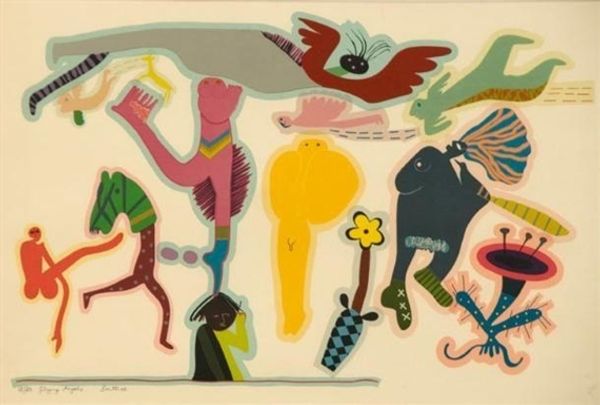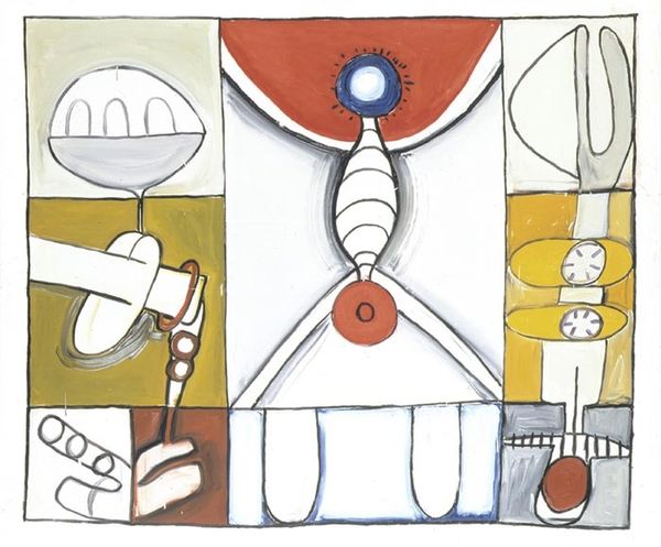 Victor Brauner made this painting, Irschou, with oil on cardboard, and what strikes me first is the way he's built this composition from the ground up through flat planes and graphic lines. It’s like he’s making a world, piece by piece. The colors in the work are so interesting. They aren't exactly 'natural', and the hues push against each other in a way that makes the whole image slightly unsettling. Like that almost acidic yellow of the character on the left, or the dog. Look at the lines he uses to define each of the figures, these bold, graphic outlines that don't just describe but also seem to contain them. It's like the painting is both a collection of forms and a set of boundaries. Brauner's got this sense of humor and depth of thought, a kind of playful surrealism that he shares with artists like Joan Miró. Irschou is not just something to look at, but to wander around in, finding new connections and meanings each time.
