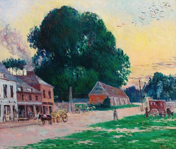 Isaac Levitan created "Huts after Sunset" with oil on canvas. It’s a scene built from a series of brushstrokes, clearly showing the artist's hand in the work. The way Levitan has applied the paint is very telling. Thick, almost hurried strokes construct the silhouettes of the huts and the surrounding landscape. Look closely, and you can almost feel the texture of the wood grain and the rough, uneven surfaces of the buildings. The artist seems less interested in precise representation, and more in capturing the atmosphere of twilight in the Russian countryside. The social context here is critical. Levitan wasn't just painting a pretty picture, he was documenting the lives of ordinary people in a rapidly changing world. The labor is not depicted directly, but in the forms of basic shelter. The painting prompts us to consider the relationship between art and life, between the experience of the artist and the social realities of the time. It invites us to look beyond the surface and appreciate the stories embedded within the materials and the making.