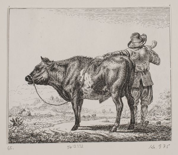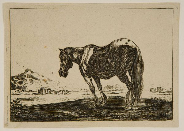 Curator: Pieter van Laer, known for his contributions to genre painting in Rome, created this piece titled "Horses." Editor: My first thought? Tired. Both the horse and its handler seem pretty weary. There's such a strong sense of gravity. Curator: The image, with its focus on everyday life, reflects the "Bamboccianti" style of genre painting Van Laer helped popularize. Horses often symbolized status, work, and the rural idyll. Editor: I get a different feeling from it, though. Maybe it's the starkness, but I see a commentary on the harshness of work, the burdens these animals carried. Curator: The lines certainly convey that sense of burden. There's a weightiness to the etching technique that underscores the physical strain. Editor: Well, it’s given me a lot to think about. Makes you realize how much stories can be contained in such a small image.