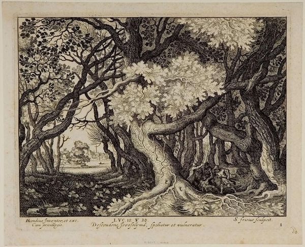 Editor: Wow, this print just pulls you into a shaded, secret world. I feel like I could get lost in there, in a good way. Curator: Aegidius Sadeler II, active in the late 16th and early 17th centuries, created this landscape, titled "Wood with on the Right a Pool". We can consider its place within the context of European landscape art and its relationship to ecological perceptions of the time. Editor: Ecological perceptions? To me, it feels more like a personal escape, a refuge. The way the light filters through the trees...it's almost spiritual, don't you think? Curator: I'd say it's important to understand how landscapes like these often reflect broader social anxieties and desires related to land ownership, resource management, and the changing relationship between humans and nature. Editor: Maybe. But for a minute, can't we just appreciate the quiet? Curator: Absolutely. It certainly invites reflection.