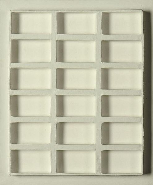 Editor: So here we have "Quadraten," a relief sculpture by Johannes Jan Schoonhoven from 1969. At first glance, it’s a pretty straightforward grid of white squares. What immediately grabs me is its quiet intensity - almost meditative, yet rigorously structured. What do you make of it? Curator: It’s wonderfully deceptive, isn't it? From afar, a perfect minimalist grid, almost robotic. But step closer, and each square dances with individuality, boasting tiny imperfections. Schoonhoven wasn't chasing cold perfection, I suspect. More likely, he was hinting at the beautiful chaos within order. Think about sand dunes or beehives – the most intriguing things are made of subtle differences. Editor: That makes me wonder, how intentional were these "imperfections"? Is he consciously disrupting the rigid order? Curator: Absolutely! Schoonhoven played a lot with shadow. The slight variations in depth create a shimmering effect, changing as you move. It’s like he is saying, "Even in the most rigid systems, there is movement and life." Were you expecting something quite so dynamic? Editor: No, not at all! I initially saw it as very static, almost cold. But now I see how the variations invite you to linger and discover the unexpected. It really challenges the idea of minimalism as purely sterile and detached. Curator: It does indeed! And perhaps prompts us to question what we truly see when we think we know something, hmm? Every viewing is another adventure! Editor: Definitely. It shows how a deeper look reveals the richness hidden within apparent simplicity. Thanks so much.
