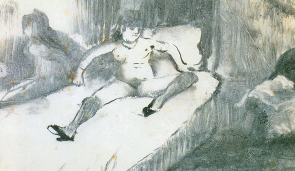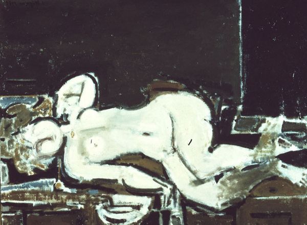 Curator: Here we have M.F. Husain's "Frolicking Ganesh," a mixed media work on canvas painted in 1974. Quite a striking image, wouldn’t you say? Editor: Striking indeed! My immediate impression is one of bold energy, though perhaps slightly unsettling. There’s a fragmented quality to the composition. Curator: Well, Husain often blended traditional and modernist styles. You can see that here in his playful, almost erotic, portrayal of Ganesha, typically a symbol of wisdom and obstacle removal. I find his palette use very interesting, don’t you? Editor: I do. The stark contrast between the crimson Ganesh and the white nude figure certainly creates a visual tension. And those blocky backgrounds... Almost a disruption. Curator: Perhaps he's disrupting the conventional portrayal of divinity. The erotic elements... well, some view them as controversial. I believe it shows the full spectrum of life, from the spiritual to the sensual, all intertwined. What do you read into this canvas, now? Editor: Structurally, there is so much to say. This composition creates an interplay of solids and voids. The heavy lines, too, contribute to its starkness. Even if the subject matter eludes you, there are contrasts everywhere. Curator: I always think, though, with Husain that there’s this joyful subversiveness. Editor: Yes, something inherently challenges the viewer to re-evaluate preconceptions, not just on aesthetic preference but of form as well, certainly when we read the symbolism together, it's something powerful. It remains an impactful and provocative exploration. Curator: Definitely. Thanks for offering this formal insight, let us move to our next piece.