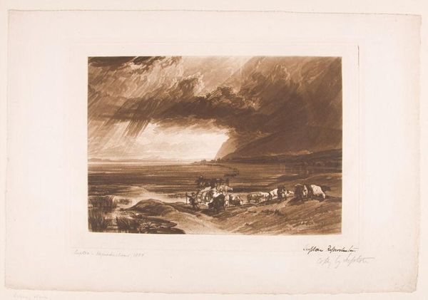 Editor: Here we have Thomas Goff Lupton’s "Solway Moss," a print held at the Harvard Art Museums. It has this brooding, almost apocalyptic feel. What symbols stand out to you? Curator: Note how the storm bears down, both a physical threat and a reflection of internal turmoil. The livestock, huddled together, could symbolize vulnerability and a primal need for community in the face of overwhelming forces. Do you see any echoes of historical events in its imagery? Editor: I hadn't considered that, but now I'm thinking about historical conflicts associated with the borderlands, as well as the ever-present struggle with nature. Thanks! Curator: Visual symbols act as cultural memory, don't they? They allow us to connect past experiences to present anxieties, a lineage of emotion rendered in form.