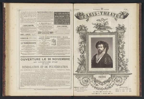 This is a photographic portrait of Benoît-Constant Coquelin, created by Ghémar Frères. It appears to be an albumen print, a process popular in the 19th century. The albumen process involved coating paper with egg white and then sensitizing it with silver nitrate. This created a smooth surface ideal for capturing fine details. Notice how this technique renders Coquelin’s features with remarkable clarity, emphasizing his gaze and the texture of his clothing. The tonal range, from deep shadows to bright highlights, speaks to the photographer's mastery of the chemistry involved. What’s interesting is the way the photograph is embedded into the printed page. The image of Coquelin becomes integrated into a broader media landscape: the page itself is filled with printed advertisements. It seems to be a page taken from a magazine, advertising the Brussels theater. This juxtaposition reminds us that photography was not just about artistic expression, but also about commerce and the construction of celebrity. It challenges our usual distinction between fine art and mass media.