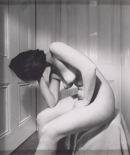 Curator: We’re looking at Bill Brandt’s "Untitled (Nude, Campden Hill, London)," a gelatin-silver print from 1956. It’s a striking composition, all soft curves and contrasting shadows. What are your initial thoughts? Editor: There's an undeniable tension here. The stark monochrome amplifies a vulnerability in the pose. This body, fragmented and decontextualized, evokes complex questions about the female gaze. It feels deeply personal, yet also unsettlingly exposed. Curator: Precisely. Brandt masterfully uses light and shadow to abstract the figure. The lack of identifiable features focuses the eye on the sculptural quality of the body itself—almost a study in form. Notice how the curves of the limbs echo each other, creating a rhythm within the composition. Editor: But that abstraction also allows the photograph to be read within the context of its time. The 1950s held complex views of female sexuality and societal expectations. This image, intentionally or not, contributes to the ongoing conversation about the objectification of women in art. Whose gaze does this photograph cater to? Curator: One could argue that Brandt isn't necessarily objectifying, but rather exploring the human form as a landscape. He crops the figure tightly, eliminating the head and feet, to emphasize shape and texture. He plays with the tonal range of the gelatin silver print, pushing the boundaries of light and dark to create an image that borders on surreal. Editor: Yet that “exploration” inevitably engages with power dynamics. This image exists within a history of nude photography—predominantly male artists depicting female subjects. Where is the agency here? The body is present, but the individual remains hidden, rendered passive. Curator: Perhaps, but I see a power in that ambiguity. The absence of context invites us to project our own interpretations onto the image, focusing purely on the interplay of form, texture, and tonality. It is a composition stripped down to its barest essentials, revealing an underlying structural harmony. Editor: Stripping it down can also be an act of violence. The photographic nude, regardless of aesthetic value, is always loaded with historical weight and potential exploitation. It's crucial to view this piece through that critical lens. Curator: It is definitely an interesting juxtaposition of form and potential sociopolitical undertones. It asks the viewers to consider what art can teach them, even implicitly. Editor: And what those lessons might perpetuate! Hopefully we've started some worthwhile discussions here for listeners.
