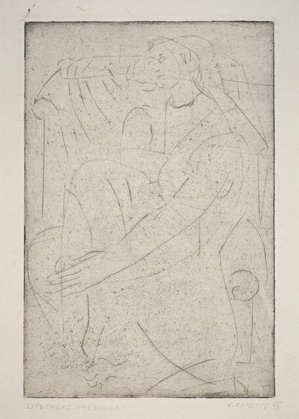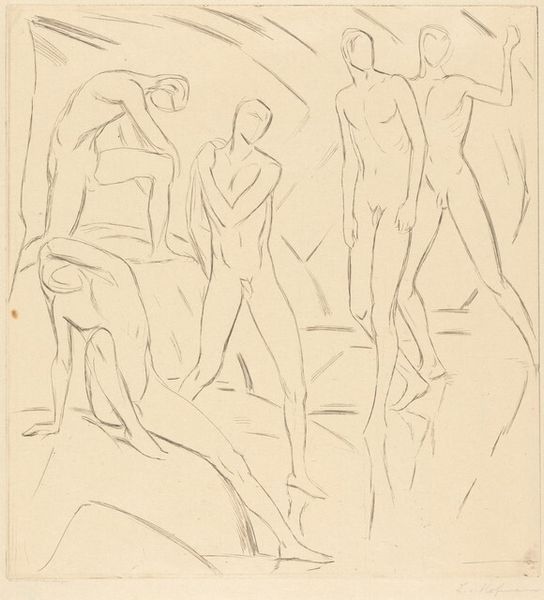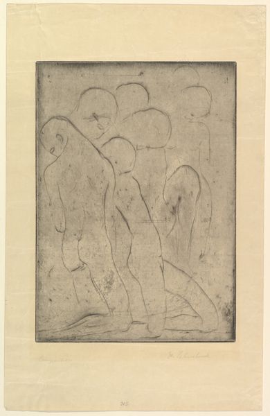 Editor: This is "Composition (Große Komposition)," an etching done in 1913 by Wilhelm Lehmbruck. I’m immediately struck by how spectral and ephemeral the figures seem, like ghosts emerging from a fog. What do you see in this piece? Curator: For me, it's all about the lines. Lehmbruck uses them so economically, barely there, yet they define form, emotion, a whole world of fragile beauty. And that off-white hue enhances the sense of faded memories or a dream just out of reach. Makes you wonder what he was trying to capture about the human condition, doesn't it? Have you noticed the figures almost seem to huddle, seeking solace? Editor: I do! I thought perhaps they are hiding? The German Expressionists are known for work conveying deep feelings, a psychological kind of realism, I thought this conveyed anxiety. Curator: Yes, that sense of seeking cover—maybe from the anxieties brewing in pre-war Europe, or perhaps it is a primal, even personal, exploration of fear itself? Expressionism, at its heart, really grabbed emotion raw—wringing it dry in ink. A powerful visual metaphor! Do you get a feeling they are touching? Editor: Barely! I almost missed that at first glance. And maybe because they aren't embracing... is that distance or yearning I detect? It's almost painful to contemplate. Curator: Precisely! That push-pull is genius. This etching invites you to look beneath the surface, scratch the skin for meaning in shadows and what isn’t drawn. To truly reflect what being human means! Editor: I'm glad you pushed me. I definitely appreciate its subtleties and emotional complexity much more now. Curator: Art always leaves breadcrumbs to meaning for anyone willing to taste the dough.