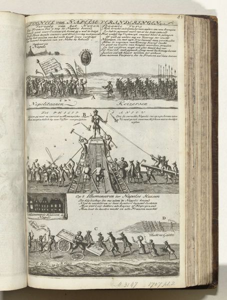 Abraham Allard created this print titled "Frankrijk bidt om vrede," or "France Prays for Peace" in 1709. It’s a scene born from the tumultuous period of the War of the Spanish Succession, a conflict deeply entwined with European power dynamics. Allard's print offers a glimpse into the anxieties of the time, where the longing for peace was palpable amidst political and economic strain. It is a critical commentary on the state of France, personified as a supplicant, kneeling before the figure of Peace. The other characters, representing France's allies, reflect the desperation and hardship caused by the war. Consider the emotional weight of this scene. Allard captures the weariness of a nation brought to its knees by war. What does it mean for a country to beg for peace, and how does this image challenge traditional narratives of power and authority?