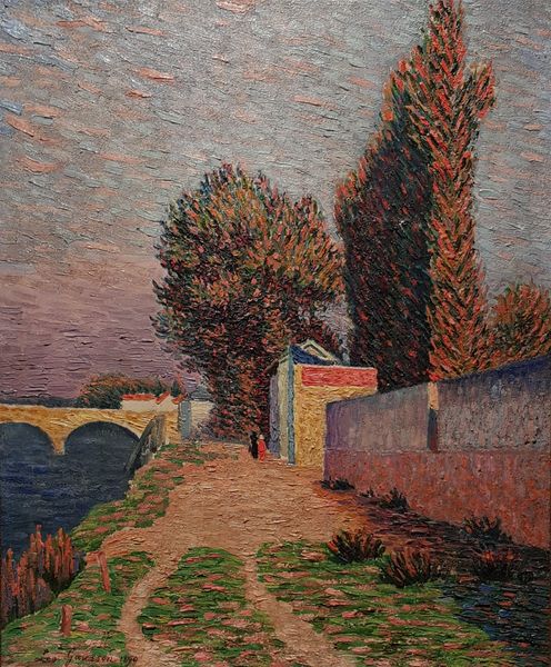 Francis Picabia's "Autumn Effect" is painted with oil on canvas, using short, textured brushstrokes that are characteristic of impressionism. The painting depicts an autumnal landscape with trees lining a canal, their leaves rendered in warm, earthy tones. Picabia’s technique here is rooted in the impressionistic style, which values the fleeting impression of light and color. The materiality of oil paint allows for a rich layering of tones, capturing the subtle nuances of the scene, like the reflection in the water. The visible brushstrokes add a tactile quality to the canvas. These artistic processes were developed in relation to the rise of industrial capitalism, and the need to capture fleeting impressions of time, motion, and space. Impressionism, with its focus on the individual artist’s perception, reflected a changing relationship to work and leisure in modernizing societies. Considering these qualities, we can better appreciate how "Autumn Effect" embodies a specific moment in art history, reflecting a particular cultural and technological context.