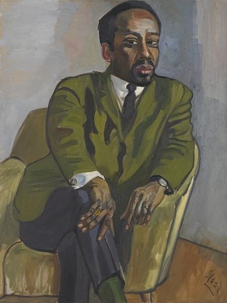 Curator: This is Thomas Hart Benton’s “Portrait of a Musician," created in 1949. Editor: It's all blues to me: that mellow bass fiddle brown against the man’s dark hair and suit, the watery cerulean background... Very cool mood, but is the guy frowning, or just concentrating? Curator: Benton’s later work is often marked by precisely this tension: a relaxed pose rendered with meticulous detail that yields something emotionally complex, and also consider how Benton portrayed his subjects, mostly Black subjects from urban scenes in America. The social context of jazz music being at the height of it's popularity is no accident here either. Editor: So, what you are suggesting is this is Benton consciously addressing jazz and the cultural shift toward American urban culture. Because the cat certainly looks in command and confident! Still... It feels like the cool cat might have a melancholic tinge; the lighting is subdued... Makes me think of the late hours these cats put in! Curator: That's interesting, isn't it? Benton was definitely interested in the real lives of his subjects, especially working-class folks who were not part of the American Dream, at least not entirely. I think you’re right; there's respect for labor in this work as well. It elevates a musician into a kind of iconic, or at least individualized presence, against the rise of industrialist or conformist archetypes often being propagated post World War Two in most white communities. Editor: It gets me thinking of my own connection with jazz... All those lonely nights of creation; toiling away in obscurity... Maybe that melancholy is more universal; the lonely labor of creativity in general! And this artist found it too; painted right into the composition for all posterity. So dope. Curator: Exactly! That tension speaks volumes about Benton's process of representing modern America. Thanks to your insightful read of Benton’s harmonic spectrum in the material presentation and contextual implications, I feel I know it better than before. Editor: My pleasure! Sometimes, you have to see what resonates and trust your senses! And on that note...let the record play.